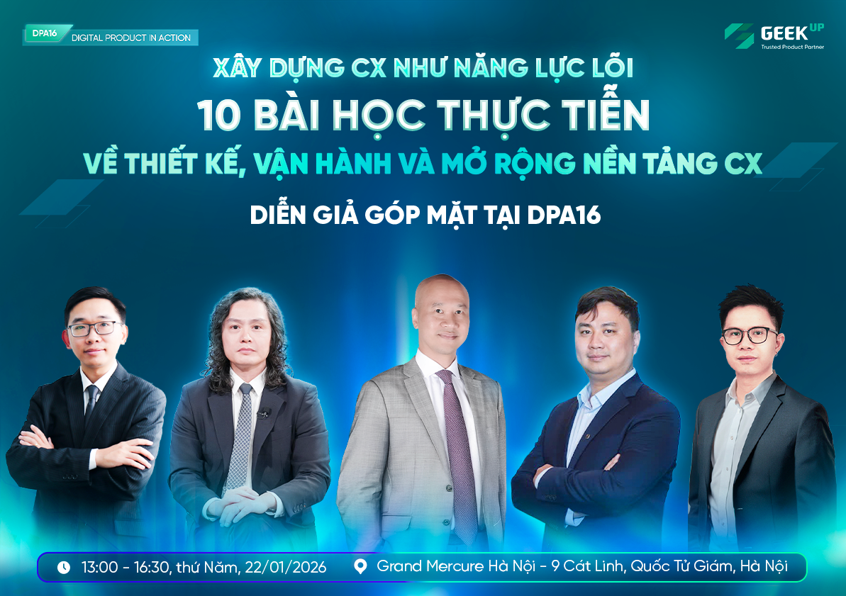 Trên cơ sở đó, ngày 22/01/2026, GEEK Up tổ chức hội thảo DPA16 – Xây dựng CX như năng lực lõi tại Hà Nội, với sự tham gia của các lãnh đạo và chuyên gia cấp cao từ KPMG, LPBank, Vietcombank và đội ngũ GEEK Up để cùng nhau trao đổi về cách xây dựng CX Platform như một năng lực cốt lõi, thay vì chỉ là tập hợp các sáng kiến rời rạc.